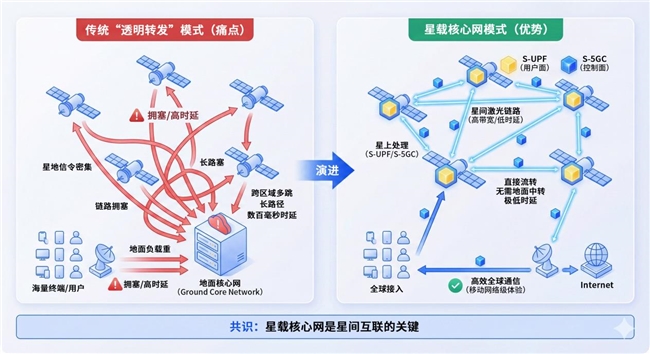 要理解星载核心网的意义,必须先回到低轨卫星互联网最本质的痛点:时延与并发。传统的“透明转发”卫星模式里卫星只负责把链路“搬运”回地面核心网处理。随着星座规模扩大、终端数爆发,这种模式的短板越来越明显: