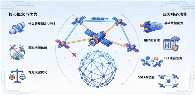 星载S-UPF是装在卫星上的用户数据处理网元,专门负责转发用户数据、接通电话、建立通信连接、保障通信安全这些关键功能,同时深度融合卫星间激光链路优势,支持专线业务、语音业务、局域网业务等通过激光链路实现星间直达,彻底摆脱对地面核心网的依赖,为星地融合通信场景提供高效的用户面功能支撑。