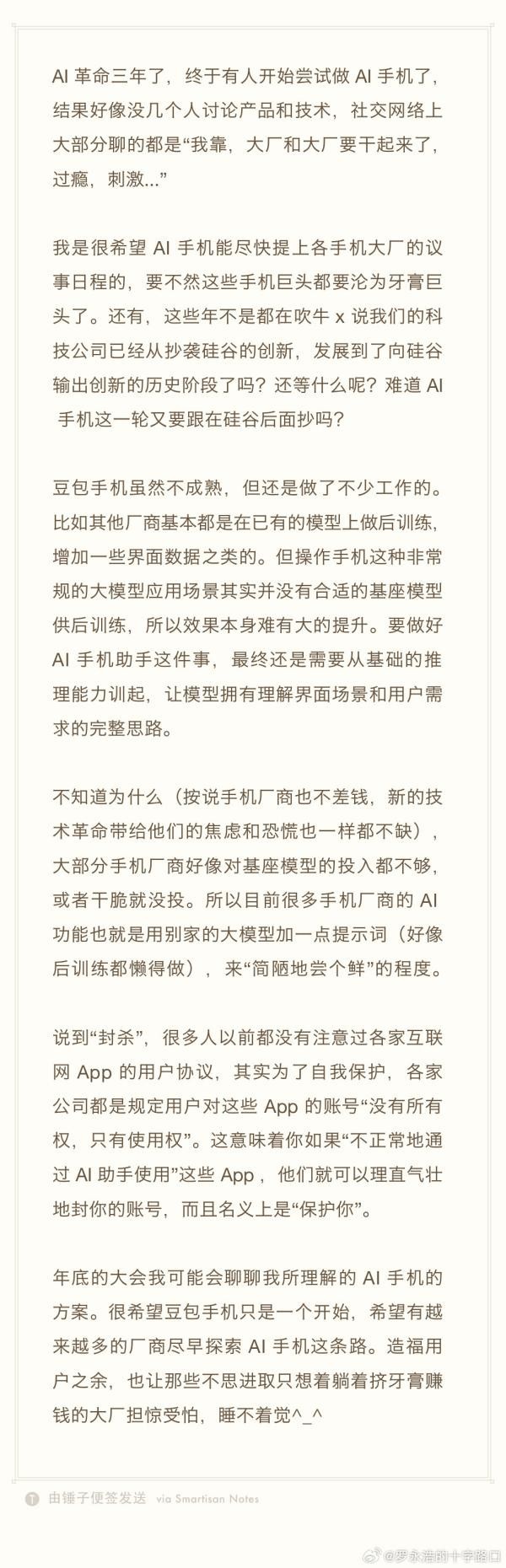 罗永浩坦言不解:手机厂商既不缺资金,也不乏技术焦虑,却鲜有对基座模型进行实质性投入。“目前很多所谓的AI功能,不过是调用第三方大模型,加几条提示词,连后训练都省了,只能算‘简陋尝鲜’。”