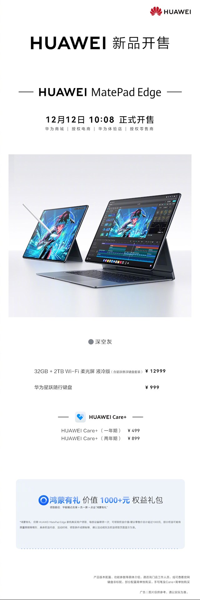 快科技12月12日消息,华为今天正式宣布,首款鸿蒙二合一平板电脑MatePad Edge液冷版正式开售,提供32GB内存 +2TB存储,官方定价12999元。