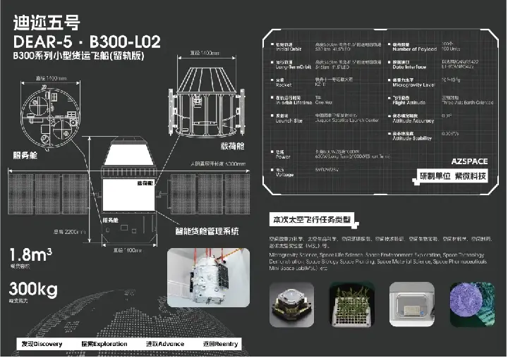 本次成功发射的“迪迩五号”是紫微科技自主研发的小型货运飞船留轨版(B300-L),已满载300kg,载货空间1.8m³,具备超过100个载荷的在轨管理能力,设计在轨运行时间1年。