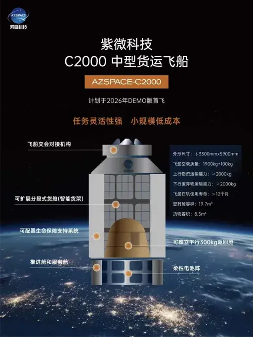 根据协议内容,紫微科技将在成都经开区投资建设研发制造基地。基地核心任务聚焦两款核心航天产品研制,一是C2000中型货运飞船,设计运载能力达2000公斤,主要承担空间站货物补给、下行返回及在轨构建商业空间站等任务;二是轨道转移飞行器,重点突破在轨加注、交会对接等关键技术。项目以航天器整船研制为核心,将构建覆盖关键部件研制、系统集成、试验验证到空间应用服务的完整产业生态。