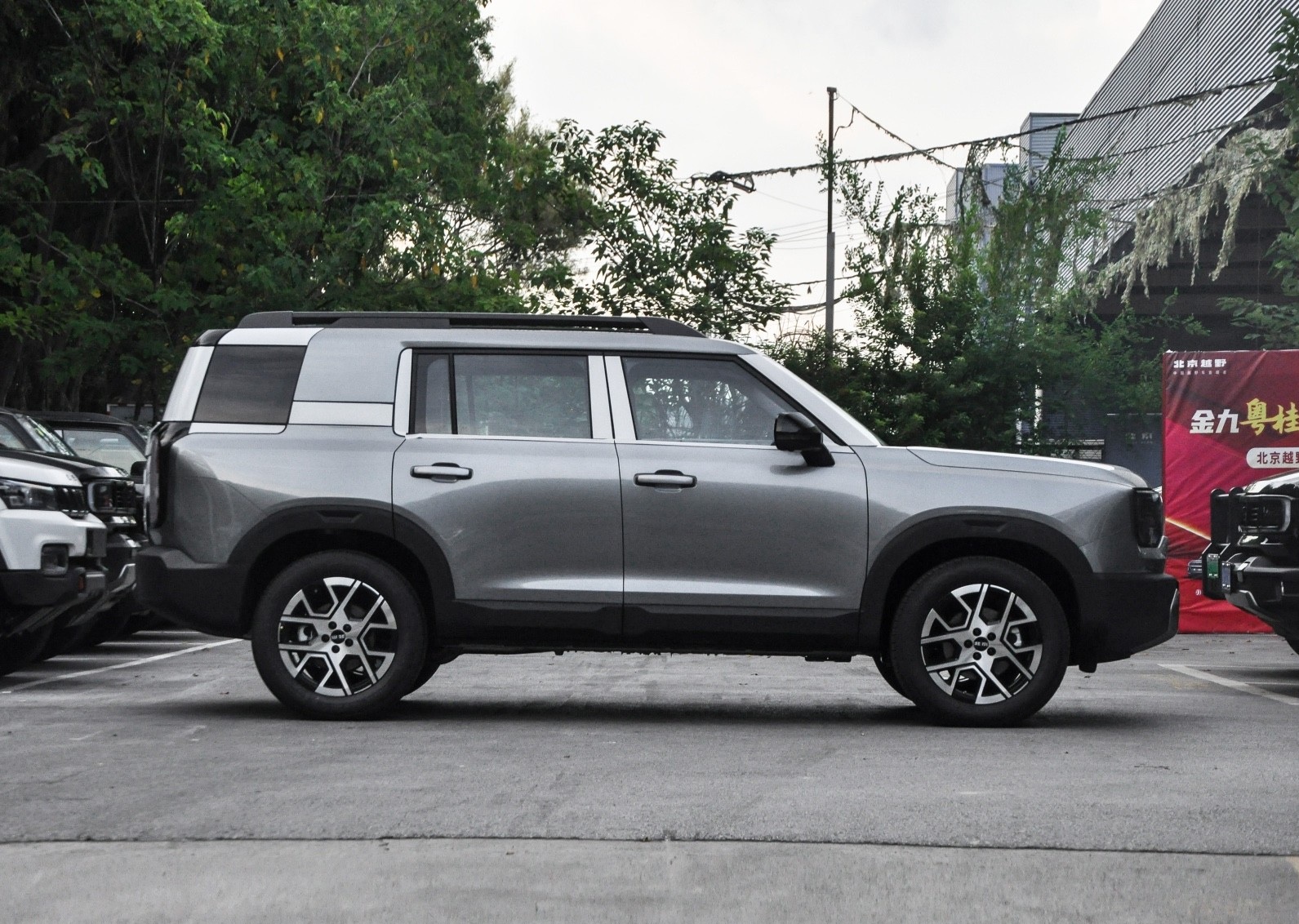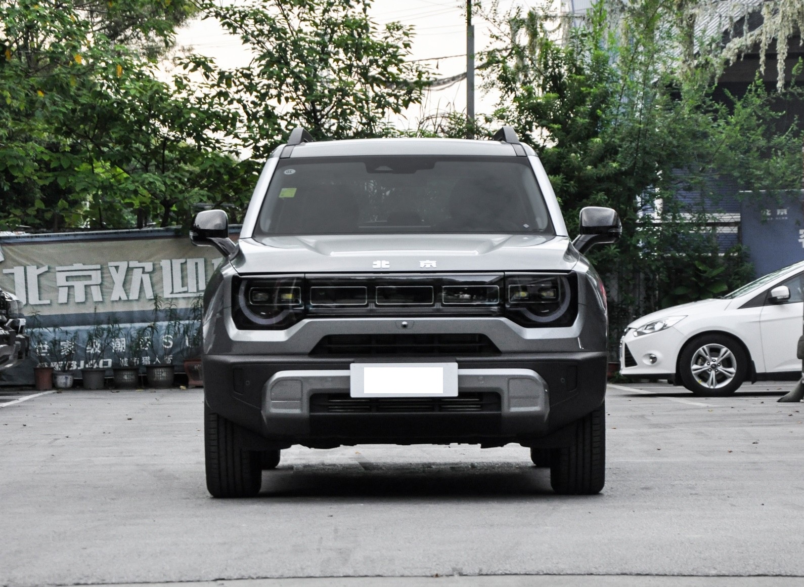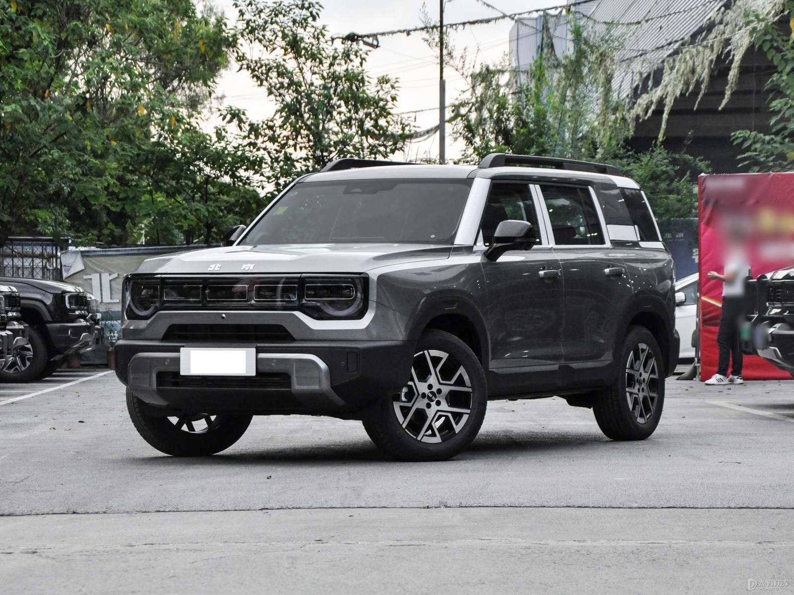 我们首先来看新车的外观设计方面,车头造型延续了北京越野标志性的五孔星环日行灯设计,在保留家族辨识度的同时,通过哑光铂金灰护板与宽厚黑色保险杠的搭配,强化了硬朗的视觉冲击力。LED大灯组采用纵向排列布局,与进气格栅形成垂直呼应,配合下方银色护板,既提升了科技感又彰显了越野属性。这种方盒子造型的前脸设计,通过棱角分明的线条切割,让车头呈现出强烈的力量感,尤其在加装旅行家灯语书包后,整体气势更显威猛。
