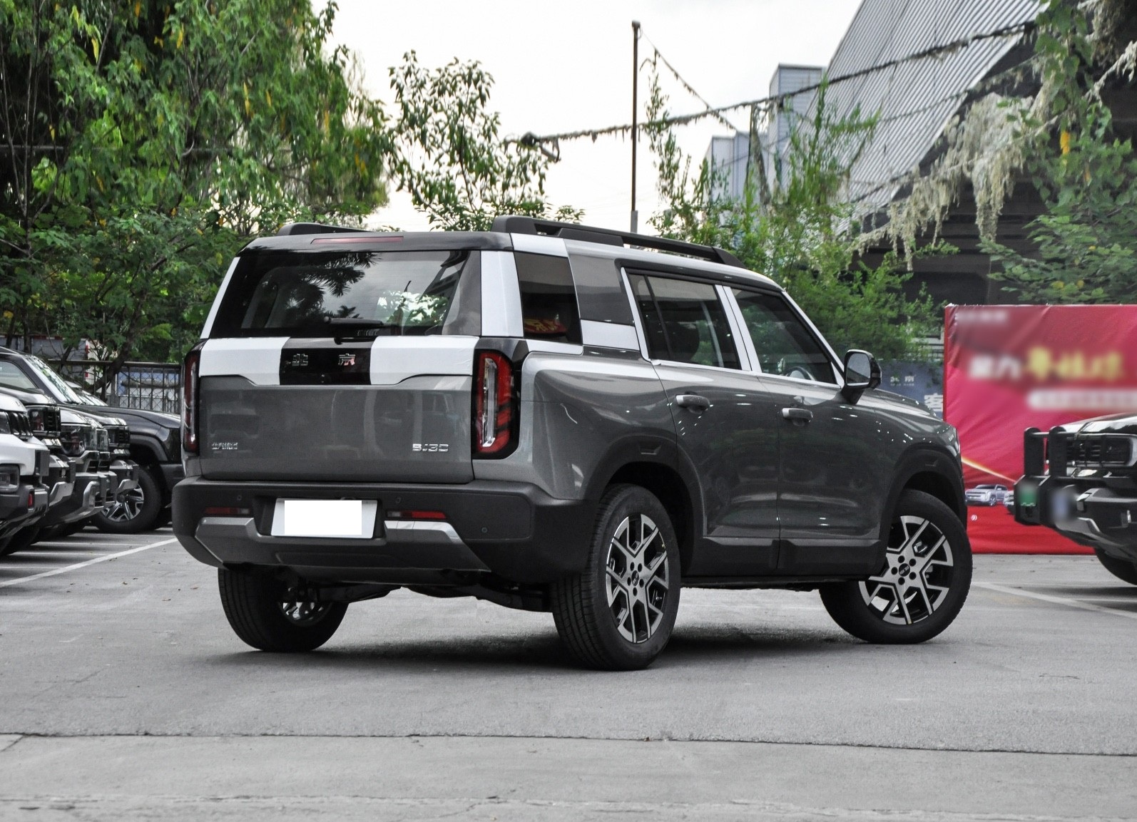 再来看车尾部分,车尾设计通过三段式分层结构展现出独特的层次感:上方是延伸至车顶的黑色挡风玻璃,中段为哑光铂金灰车身主体,底部则搭配粗壮的黑色下包围。纵向排列的LED尾灯组采用D字形光源设计,点亮后与前灯组形成视觉呼应,而创新设计的灯语小书包取代传统备胎舱,内置多功能储物格的同时成为尾部点睛之笔。尾门线条方正硬朗,与车头造型形成强烈统一,后保险杠的双边排气装饰口进一步强化了越野气息。这种既保留经典方盒子神韵,又融入现代功能美学的设计,使车尾在实用性与辨识度之间取得完美平衡。