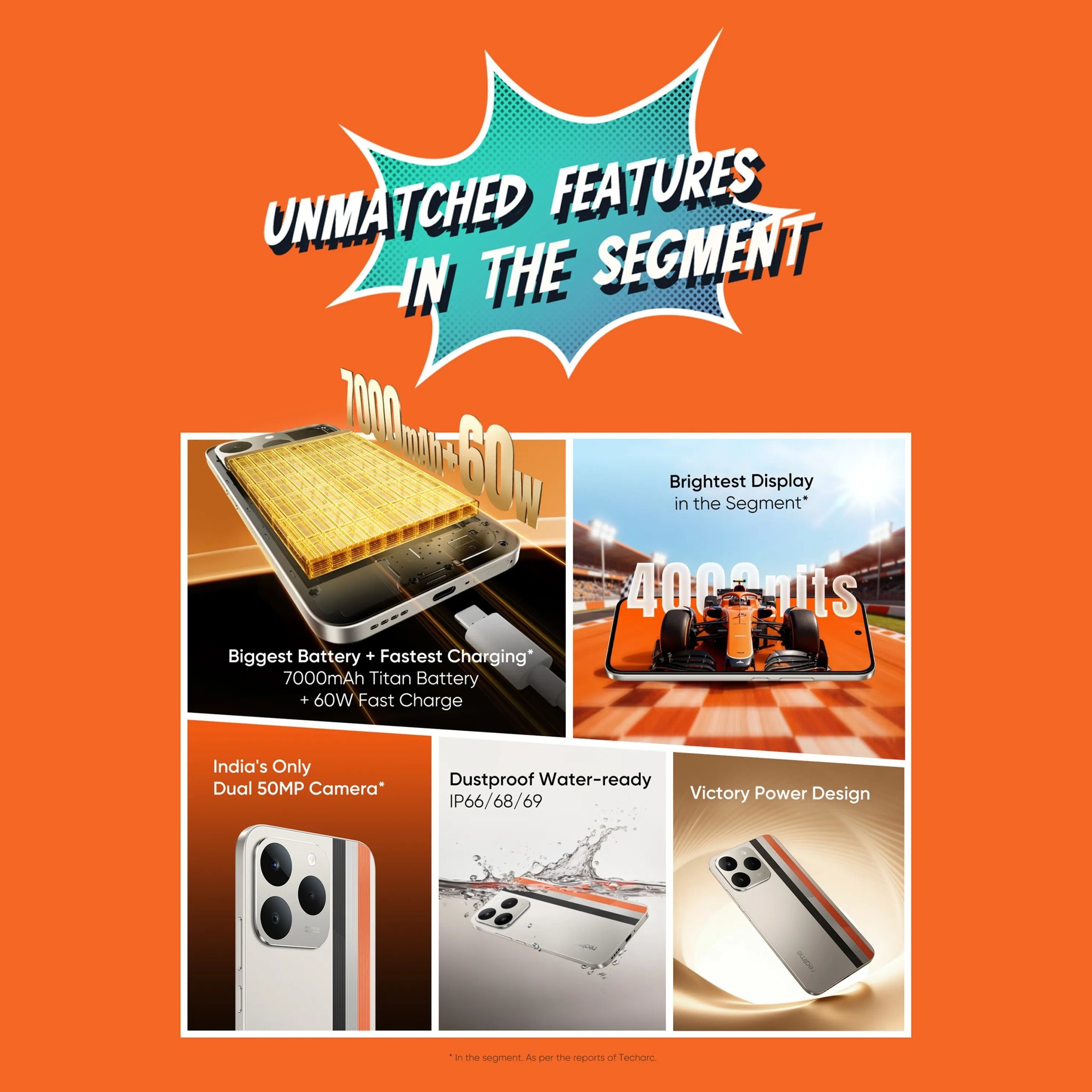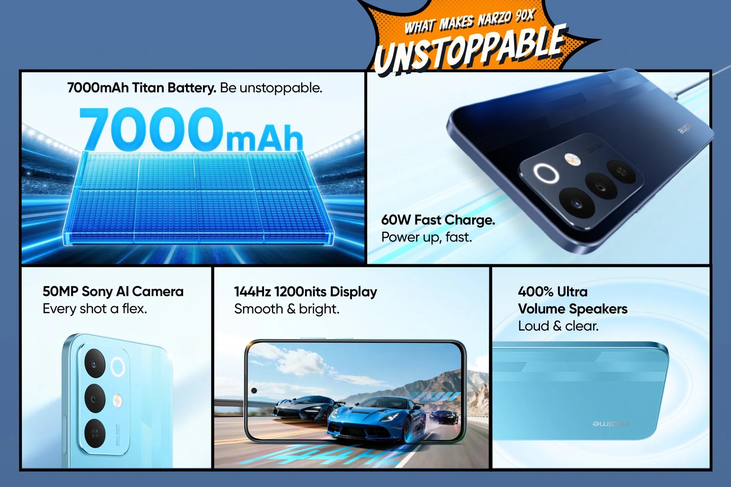 真我Narzo 90X则定位更下沉的细分市场,采用AeroFlow空气动力学设计,提供氮气蓝和闪电蓝两种配色,搭载联发科天玑6300芯片,配备6.8英寸LCD屏,支持144Hz刷新率,峰值亮度为1200尼特。后置摄像头与Narzo 90保持一致,但前置摄像头降至800万像素,最低配置的6GB+128GB版本售价13999卢比(约合人民币1100元)。