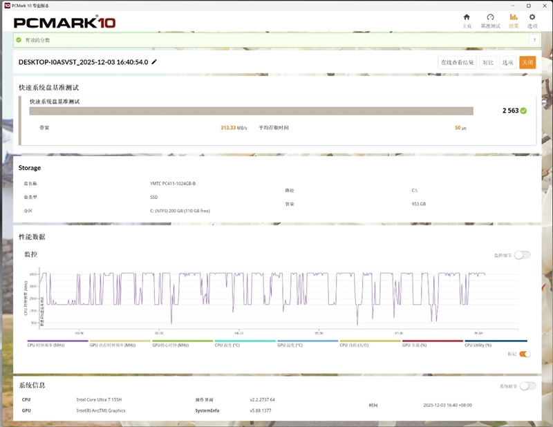 长江存储PC411 1TB SSD快速系统盘基准测试中获得2563分,存储带宽313MB/s,平均存取时间50微秒。