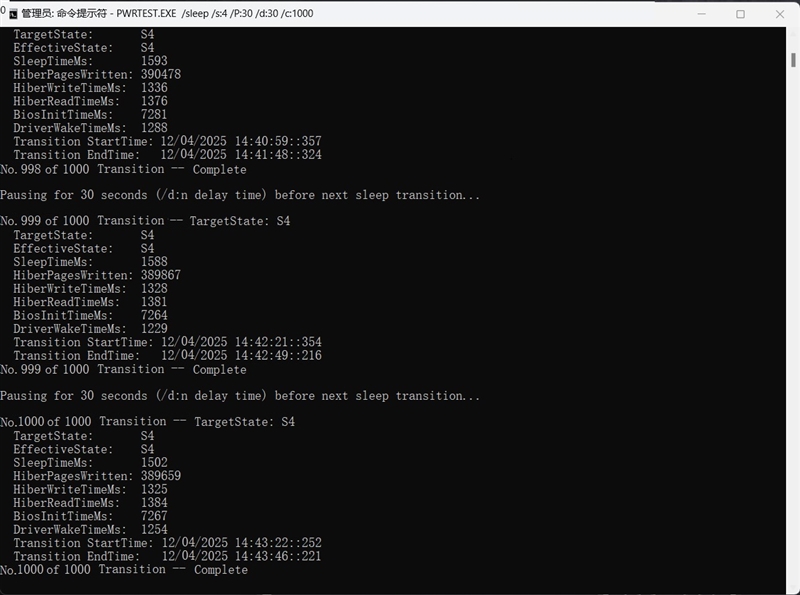 使用Windows系统自带的PWRTEST命令行工具,每次睡眠30秒,然后强制唤醒,共计睡眠唤醒1000次,全部正常完成,没有发生任何错误。