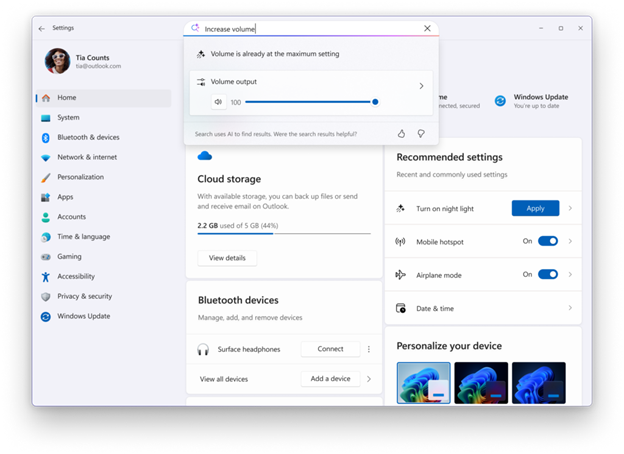 其次,新版增强“设置中智能体”(Agent in Settings)功能,用户在搜索设置项后,系统不仅会提供更多相关结果,还能直接在搜索浮窗中通过 AI 智能体调整参数。