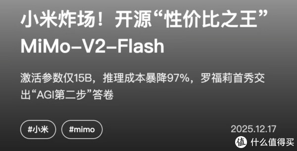小米最新发布的MiMo-V2-Flash大模型,以架构革新与极致性价比,为开源AI赛道树立新标杆。这款309B参数的MoE架构模型,凭借256个专家的动态激活设计,仅用15B激活参数就实现了性能与效率的完美平衡,堪称技术普惠的典范。