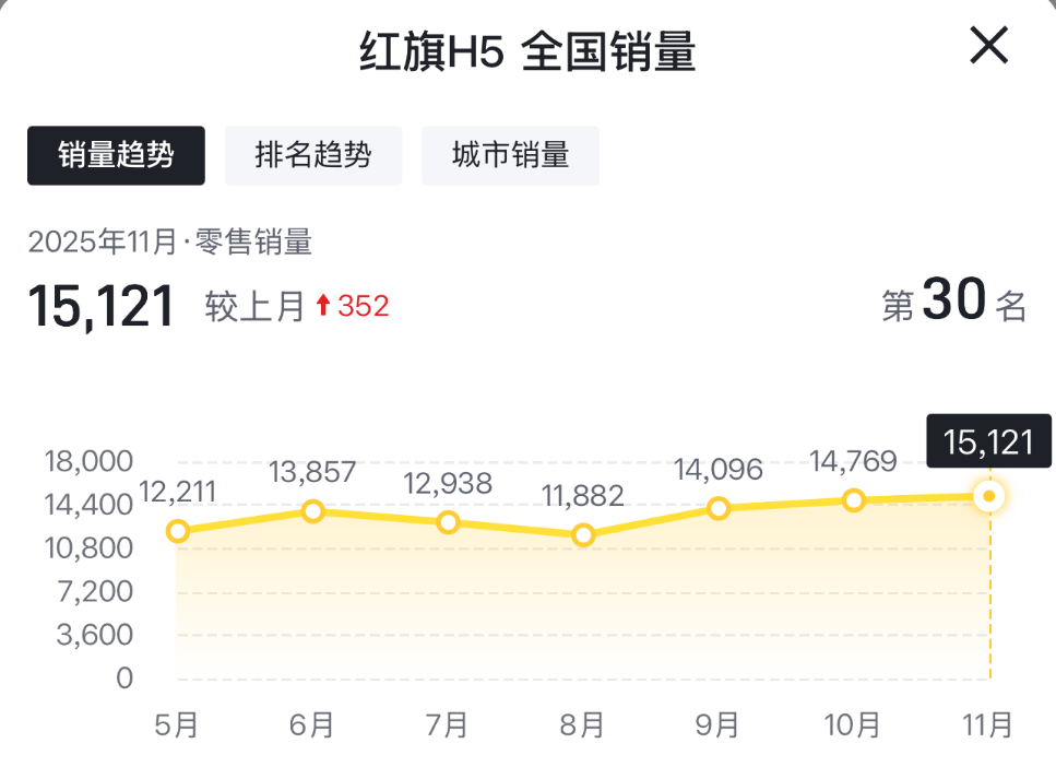 更难得的是,在新能源渗透率不断提升的背景下,红旗H5作为一款燃油轿车,今年下半年不跌反涨,11月零售量超过了1.5万辆。力压雅阁、星瑞,在燃油B级车中仅次于帕萨特、凯美瑞和迈腾。