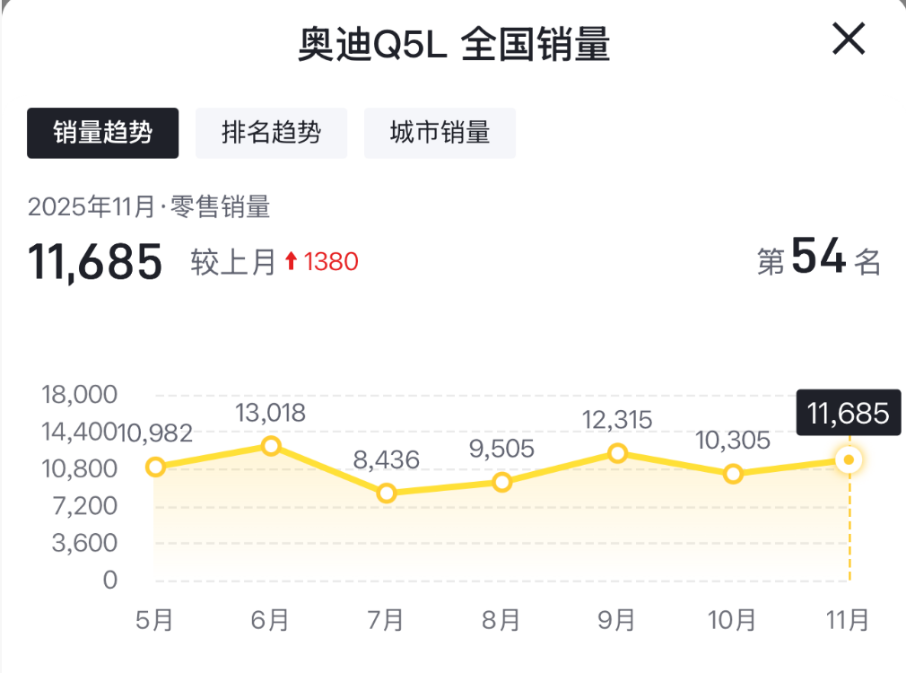在奔驰GLC、宝马X3和奥迪Q5L这三款热门豪华SUV中,奥迪Q5L是迄今换代最迟的一个,上市至今已经过去了7年多。但是Q5L的销量至今都非常坚挺,在竞争早已白热化的豪华市场上,今年11月零售量依然达到了1.17万辆。