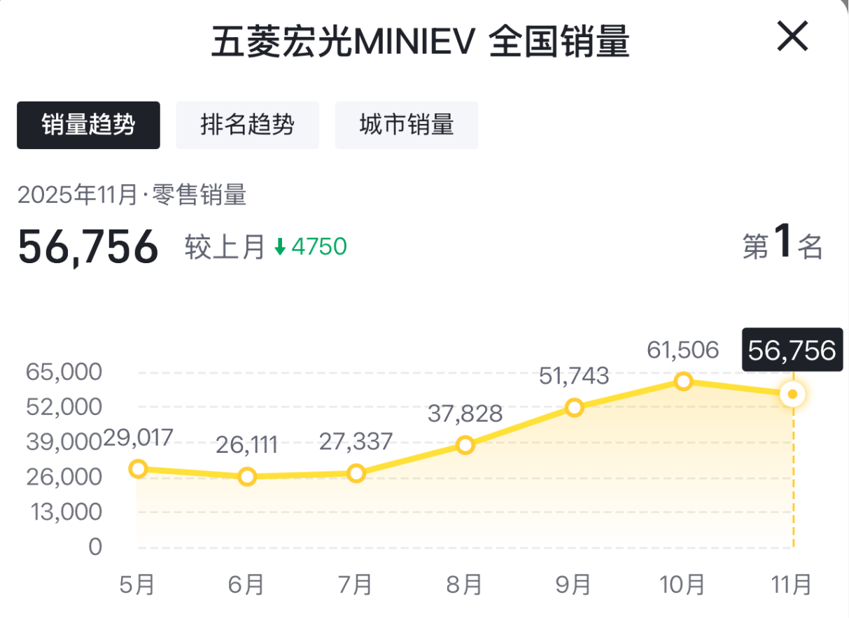作为纯电微车界的初代爆款,五菱的宏光MINI EV可以说是同类车型的开山鼻祖。随着比亚迪海鸥、吉利星愿等A0级电动小车上市,宏光MINI EV的销量一度有所下滑,但在今年2月推出四门版之后,宏光MINI车系的销量再度回升,11月份以5.7万辆的成绩拿下所有品类车型的销冠。