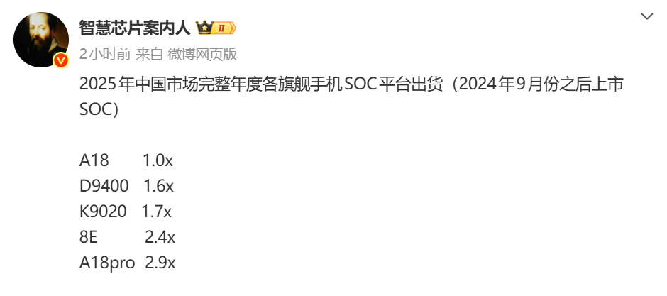 数据显示,以苹果A18为1.0倍,A18 Pro以2.9倍的出货量位列第一。高通骁龙8至尊版以2.4倍的出货量位居第二,华为麒麟9020以1.7倍紧随其后,联发科天玑9400则以1.6倍出货量位列第四。