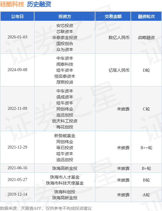 证券之星消息,根据天眼查APP于1月3日公布的信息整理,珠海市硅酷科技有限公司战略融资,融资额数亿人民币,参与投资的机构包括安芯投资,芯联资本,华泰紫金投资,国投创合,众为资本。