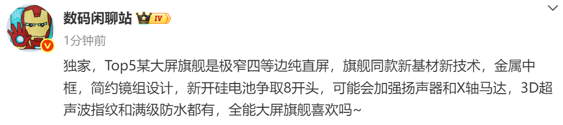 在核心配置方面,新机有望搭载容量超过8000mAh的新一代硅基电池;同时,扬声器系统与X轴线性马达或将得到加强,以提升影音与触感体验。此外,该机还将配备3D超声波指纹识别和满级IP68/69级防水能力,定位“全能大屏旗舰”。
