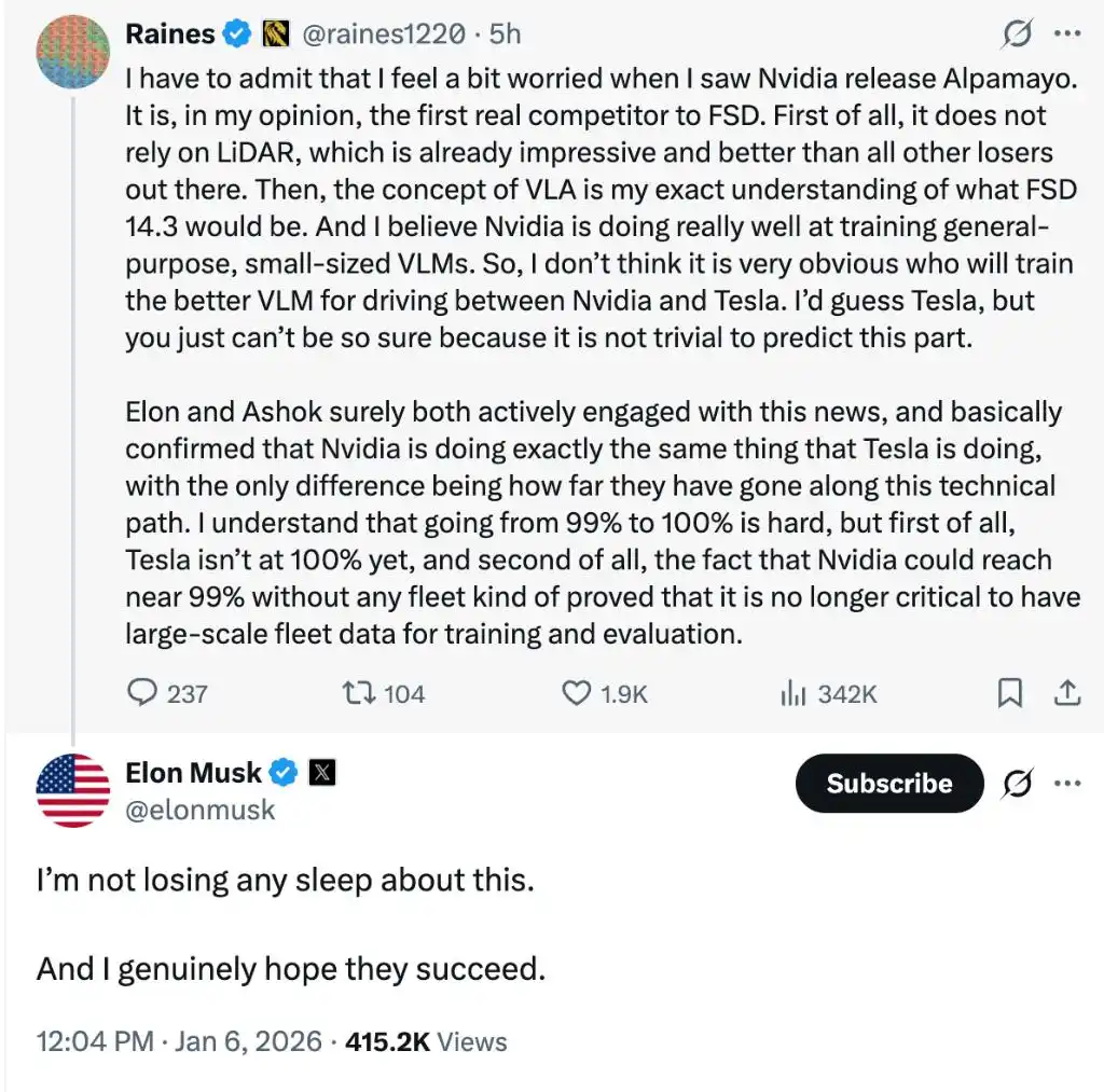 马斯克的回应也颇为有趣,有网友担心Alpamayo会成为FSD真正强有力的竞争对手,并指出NVIDIAdeed技术可以在没有任何车队的情况下达到99%的水平,证明大规模车队数据集的重要性在减弱。
