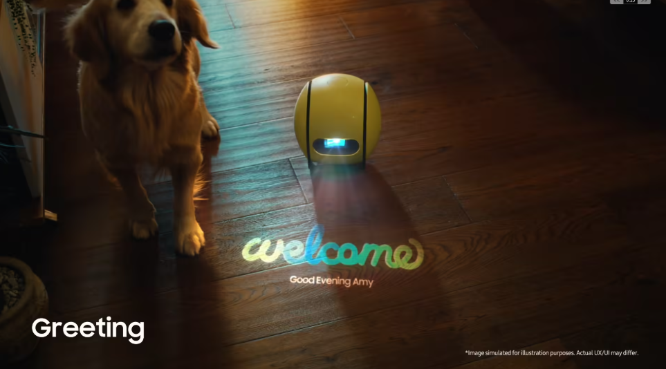 在 CES 2024 展会上,Ballie 以全新的、更圆润、更大的造型亮相,依靠三个轮子滚动。Ballie 还配备了一个环形灯,三星播放了一段视频,展示了它作为投影仪的使用。
