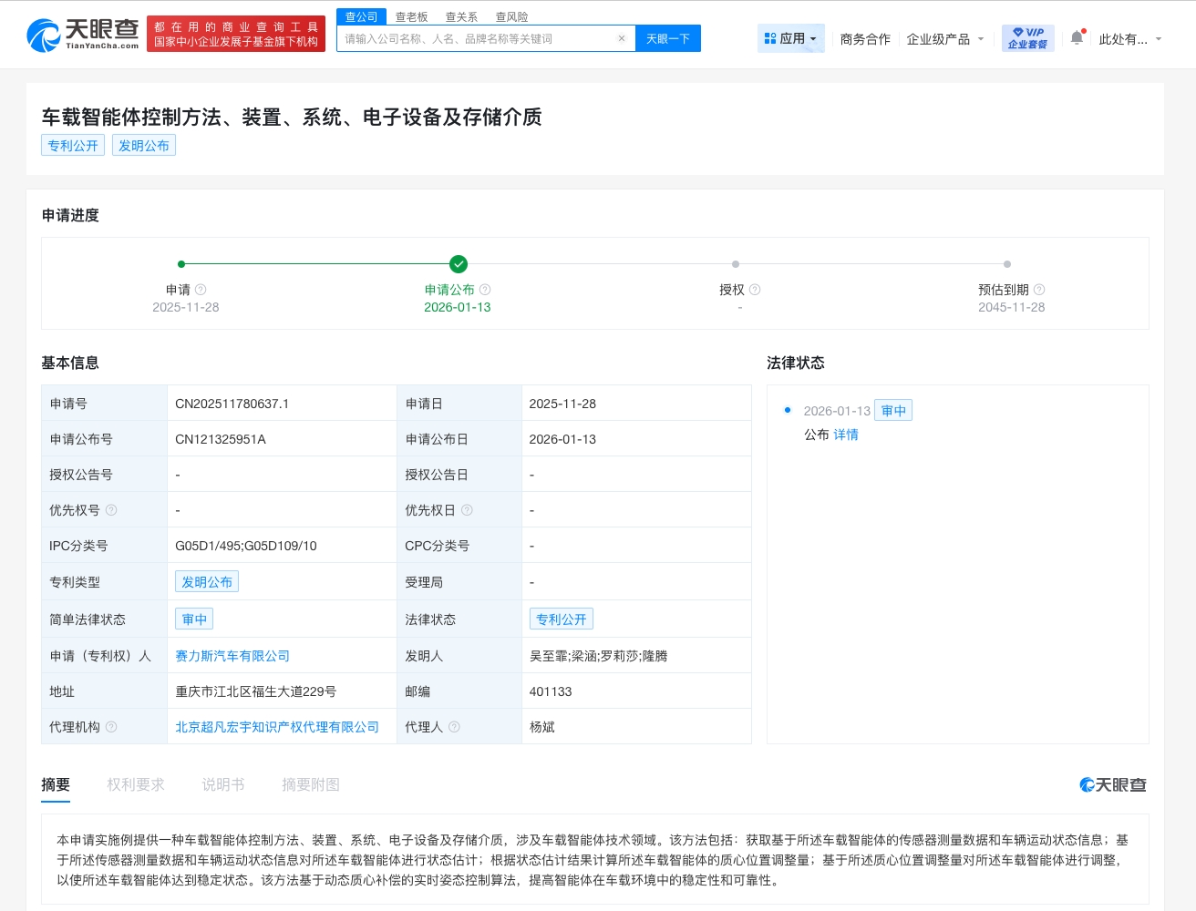 雷达财经讯,天眼查知识产权信息显示,近日,赛力斯汽车有限公司申请的“车载智能体控制方法、装置、系统、电子设备及存储介质”专利公布。
