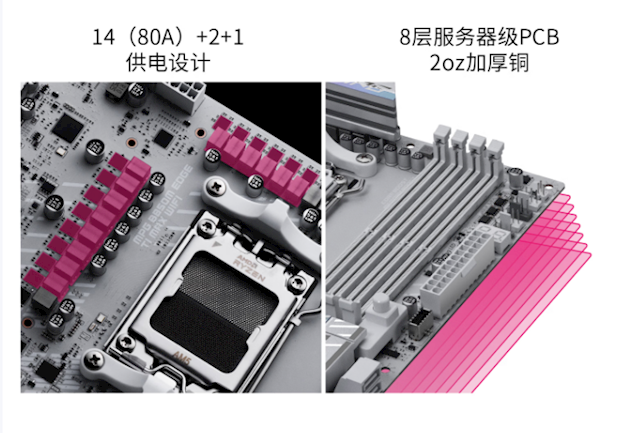 主板采用14(80A)+2+1相供电设计,配合8层服务器级PCB与2oz加厚铜,能为AMD新一代高性能处理器提供稳定高效的电力支持。搭载独立时钟发生器,支持外频调整,为超频爱好者留出充足空间。