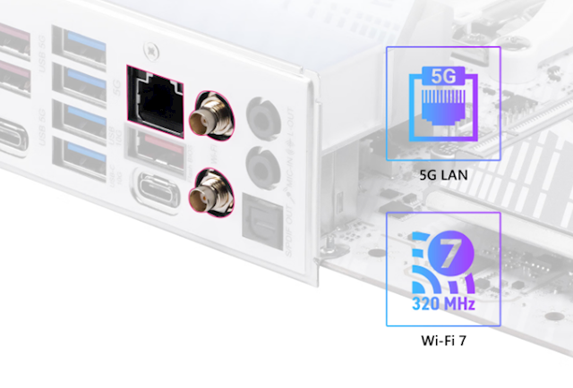 网络配置是此款主板的一大亮点,其搭载Wi-Fi 7无线模块与蓝牙5.4,配合5G有线网卡,可提供高速低延迟的网络体验。