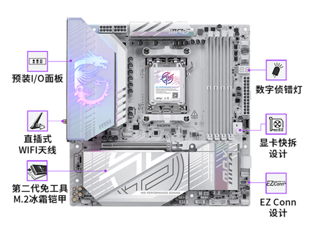 此外,主板延续“EZ DIY”理念:配备第二代免工具M.2快拆卡扣、直插式WiFi天线、显卡快拆按钮,并支持MSI CENTER统一控制中心,可实现灯光同步、性能调校与网络优化等功能。