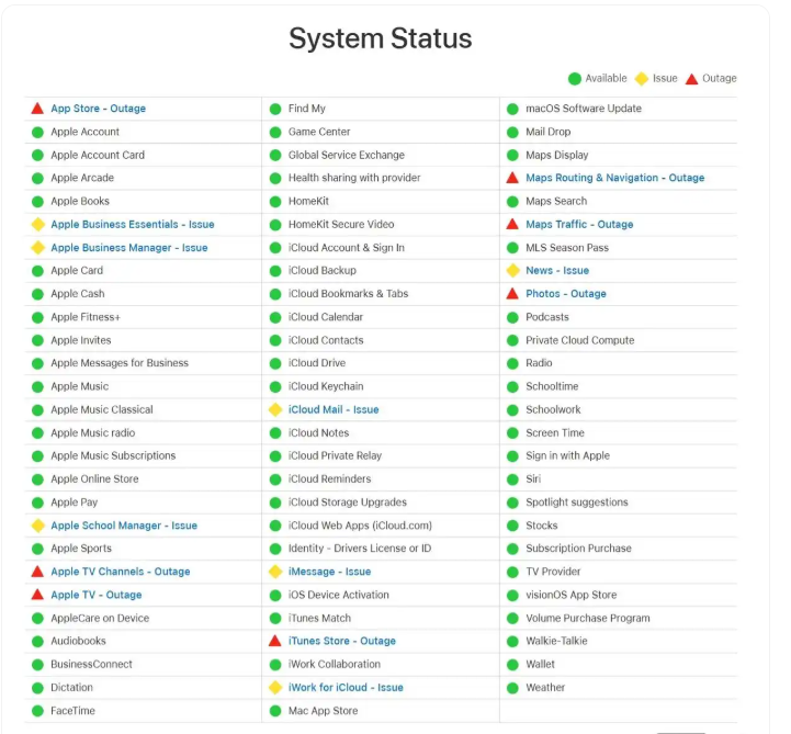 苹果系统状态页面是苹果公司官方用于实时发布其各项在线服务运行状态的公开平台。该页面会以列表形式展示包括App Store、iCloud、iMessage、Apple Music等在内的数十项服务,并以不同颜色标识其运行状况,如绿色代表服务正常,黄色或红色则代表可能出现问题或服务中断。该页面是用户和媒体了解苹果服务可用性的首要信息来源,其更新通常意味着官方已确认服务异常并开始处理。