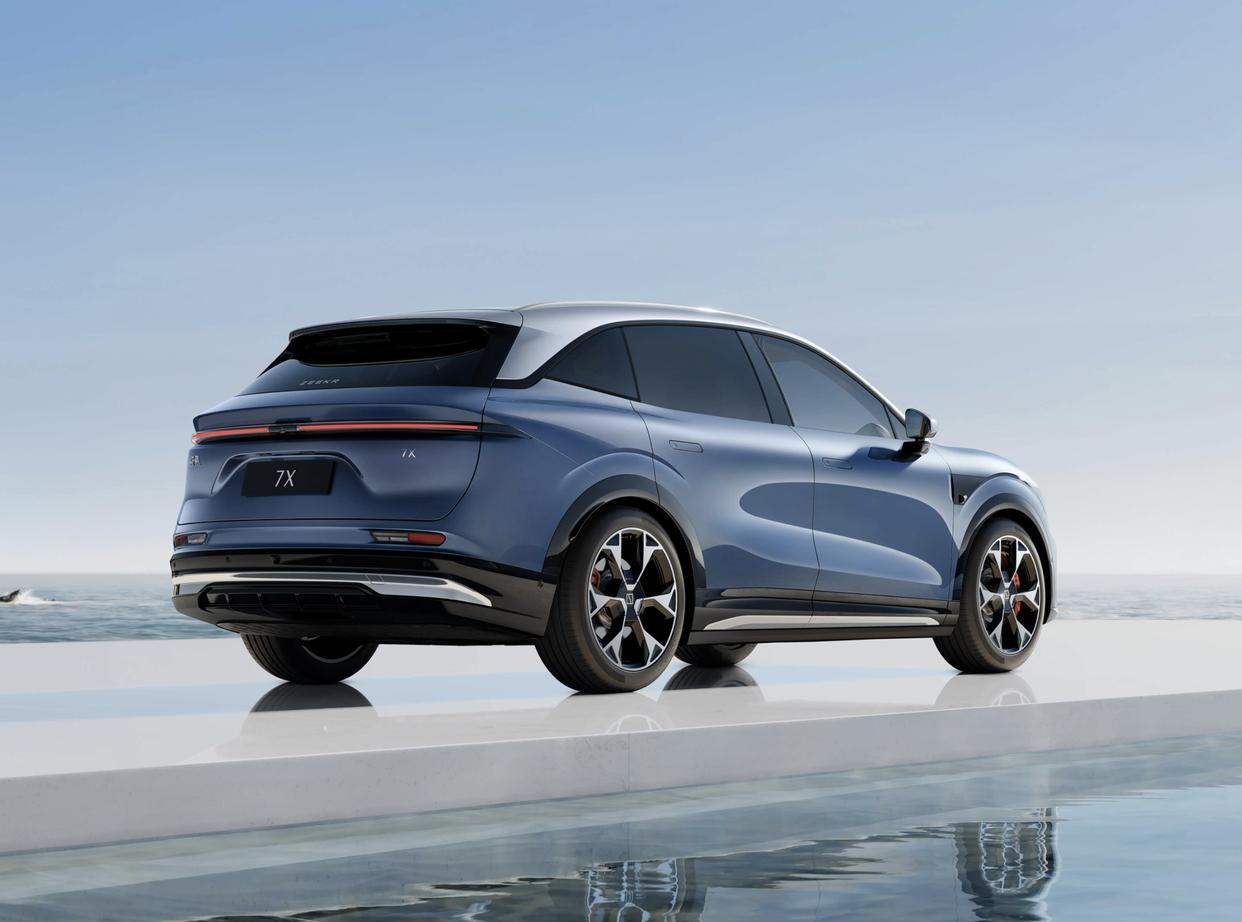 极氪7X采用了轿跑SUV的车身轮廓,倾斜的A柱与弧线形的车顶以及略带溜背式的车尾,再搭配着光影效果明显的车身型面和若隐若现的肩线、腰线设计,展现出了十分灵动的一面。四个隐藏式的门把手、四个无边框感应式车门、水滴形的倒车镜外壳,提升了整车的轿跑属性。配备了19英寸铝合金材质的轮圈,再加上银色的刹车盘和红色的刹车卡钳,进一步强化了整车的运动气息。车辆基于SEA浩瀚架构,极氪7X的长宽高分别为4825/1930/1666(1656)mm,轴距为2925mm,还拥有863mm短前悬设计,座舱得房率超过83.34%,开门角度接近90°,更加方便乘客上下车。车内采用了双层压胶玻璃,还配备后排双侧电动遮阳帘/隐私玻璃,还带有温度调节的冷箱箱、后排电动桌板/电动智慧屏,舒适性和科技感拉满。