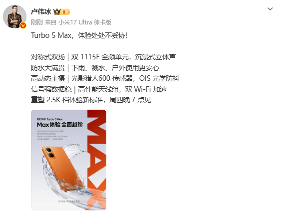 【CNMO科技消息】1月27日,小米集团合伙人、总裁卢伟冰宣布,REDMI Turbo 5 Max将搭载双1115F对称式扬声器,并通过了IP66/IP68/IP69/IP69K防水认证。此外,该机的主摄还将采用光影猎人600传感器,并配备高性能天线组,支持双Wi-Fi加速。新机将于1月29日晚7点正式亮相。