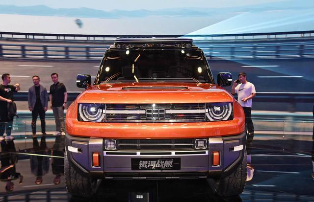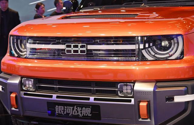 我们首先来看新车的外观设计方面,银河战舰的前脸设计堪称东西方设计哲学的完美融合。圆形"天仪之眼"大灯灵感源自古代浑天仪,配以贯穿式LED灯带,营造出复古未来主义风格。可发光LOGO在夜间极具辨识度,保险杠下方四点式光源增强了功能性。这种设计既保留了传统越野车的硬朗气质,又通过科技元素提升了现代感。前脸采用方正刚毅的轮廓,与路虎卫士等经典车型形成视觉呼应,同时通过细节处理展现出独特的东方审美。