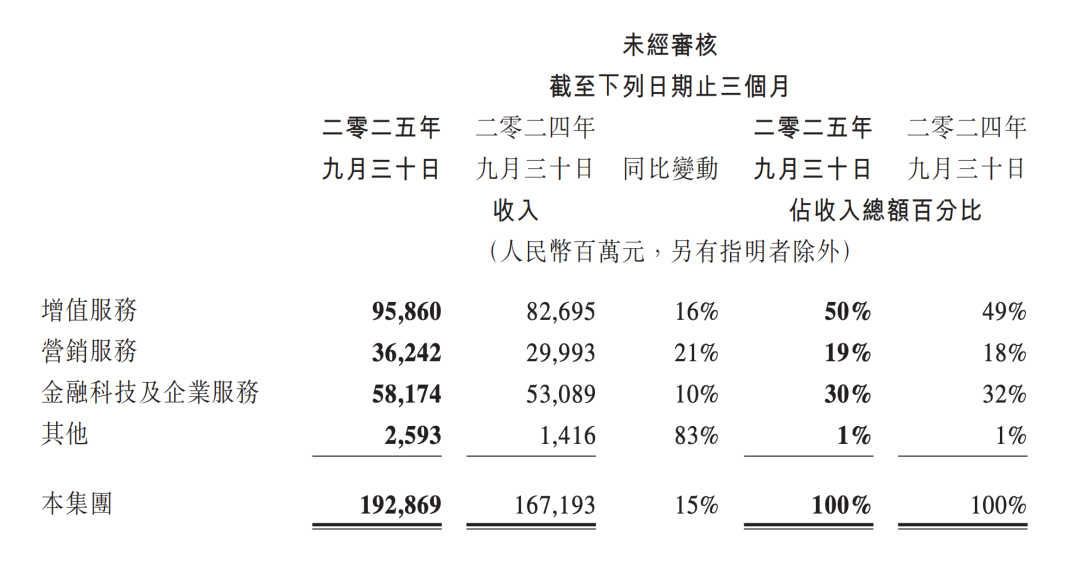 依托于QQ、微信的社交关系链,过去几年,腾讯的广告、娱乐、游戏等业务得以枝繁叶茂。财报显示,2025年Q3,腾讯增值服务营收958.6亿元,同比增长16%;营销服务营收362.42亿元,同比增长21%。