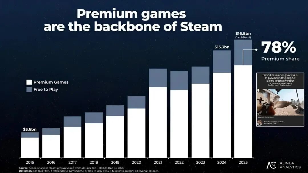 根据数据分析平台 Alinea Analytics 的最新报告,Steam在 2025 全年平台总销售额预计将超过 168 亿美元(约合人民币 1200 亿元)。