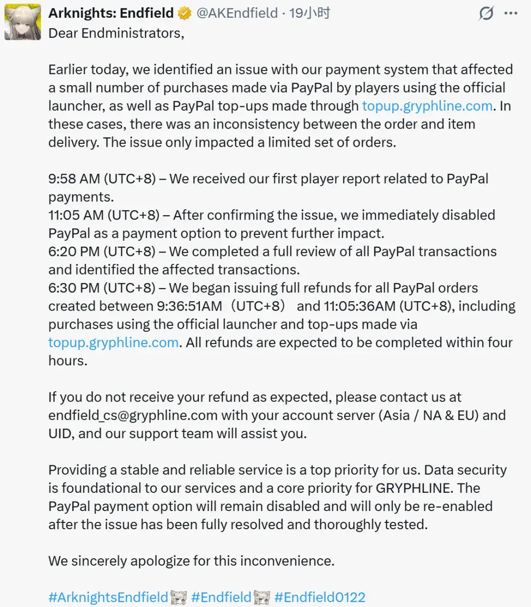移动支付网消息:1月22日,鹰角网络推出的游戏《明日方舟:终末地》在公测首日出现相关重大支付事故。对此,《明日方舟:终末地》官方表示,当日发现了公司支付系统的问题,该问题影响通过官方启动器使用PayPal进行支付的一小部分玩家,以及通过topup.gryphline.com进行PayPal充值的情况。