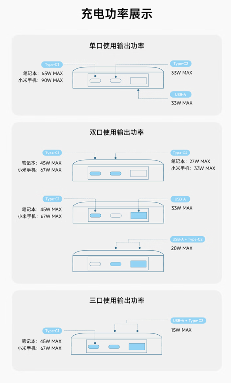 接口方面,该产品采用 2C + 1A(90W + 33W + 33W)设计,支持小米 90W MAX 澎湃秒充。