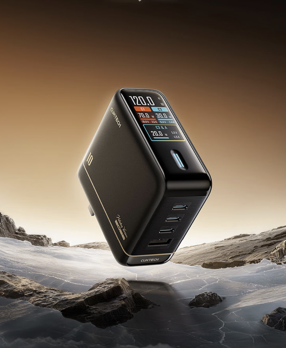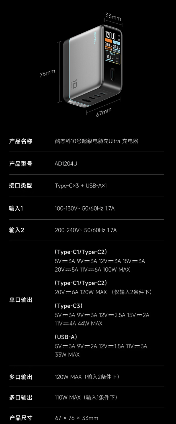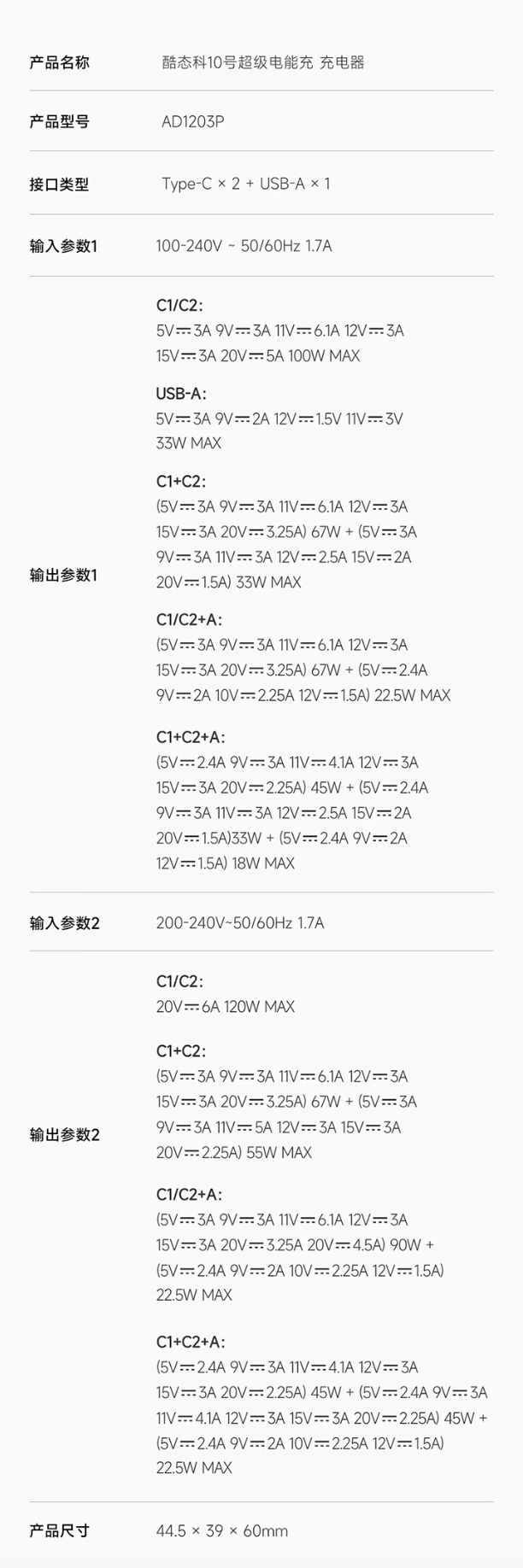 该产品整体尺寸 77.3 x 42 x 14.3 mm,采用 2C + 1A(120W + 120W + 22.5W)设计,兼容 PD、PPS 等协议,支持 ADC 2.1 快充技术,支持小米全系 120W MAX 澎湃秒充。