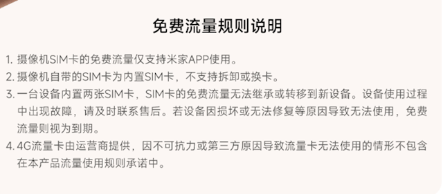 流量资费方面,内置的SIM卡流量免费使用(仅限米家App),并且还是不限量、不限速,用户不用额外充值,大幅降低长期使用成本。