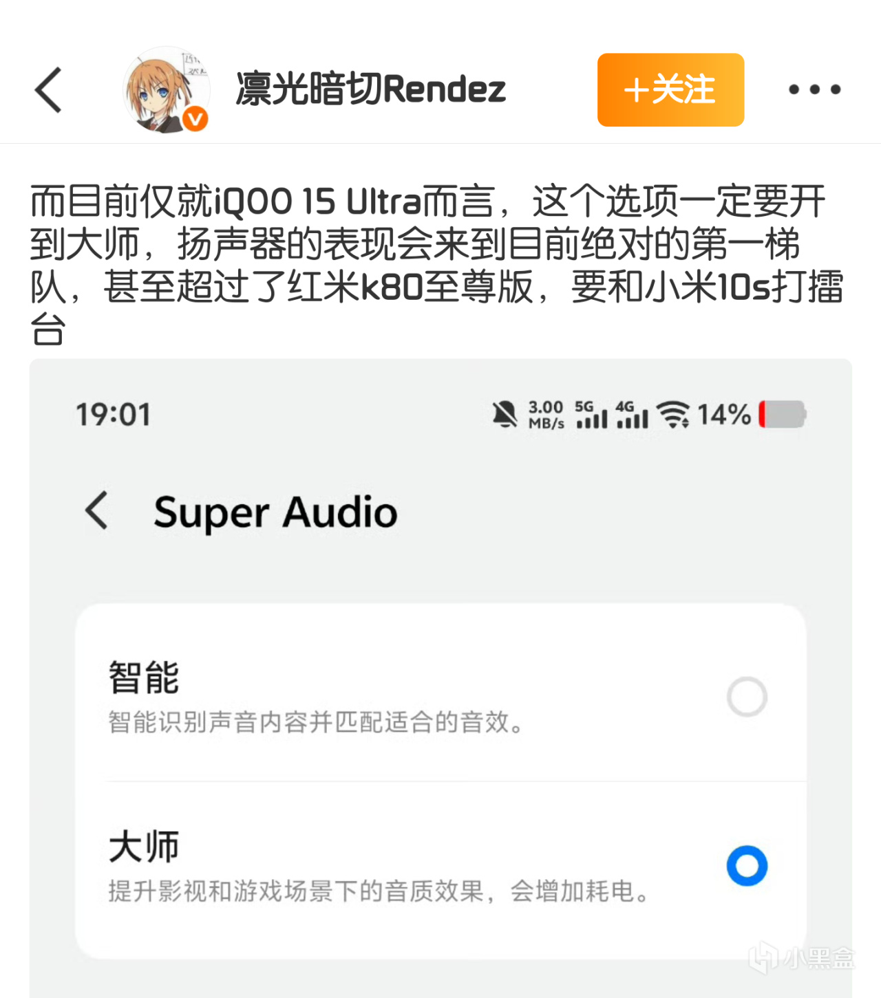 战锤马达和喇叭我想多说也说不了,因为这种东西只有自己上手才能感受得到。还是一如既往的出色!如果大家有兴趣的话可以去线下实体店里体验一下,一定可以提高你对这个手机的兴趣。独立的高音单元,让高频的延展更高。低音方面还有大师级别的磁路设计。同时iQOO15 Ultra还是爱酷首款杜比全景声,和我同感的并非只有一个。刷微博也看到有博主推荐iQOO15 Ultra的大师音效,只能说体验感是真的很不错。