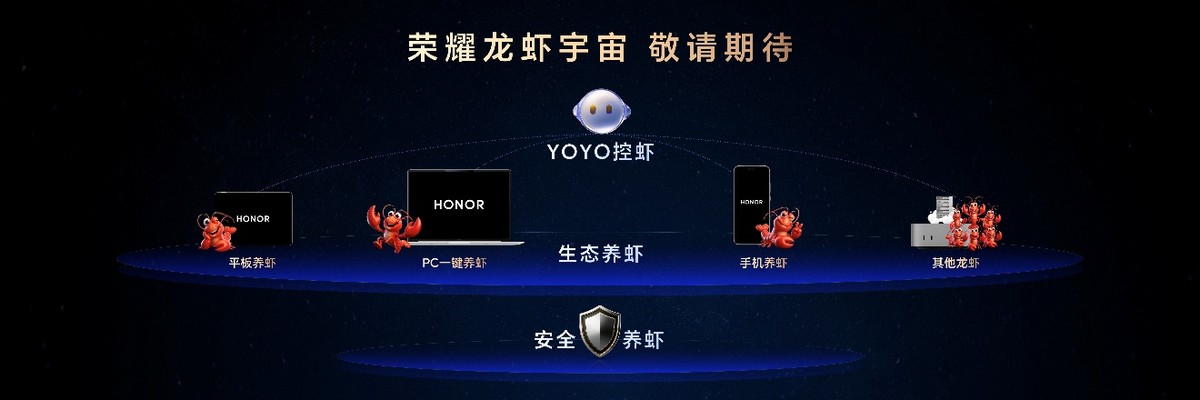 发布会上,还公布了生态级的荣耀龙虾宇宙,支持PC一键养虾、平板养虾,未来还能兼容其他生态设备的龙虾接入。用户可以通过YOYO在荣耀手机上直接和小龙虾交互,并安全地开放手机智能体供小龙虾调用,实现生态养虾、安全养虾和YOYO控虾三大能力。这些功能将于近期陆续开放内测。