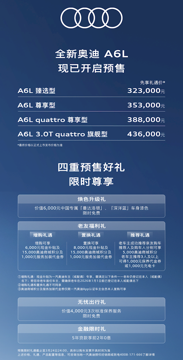 限时权益方面,在3月24日前下订,免费赠送价值6000元的中国专属“曼达洛银”、“海洋蓝”车身漆色;一汽奥迪老车主或其配偶增购,可享受6千元现金补贴及1.5万奥迪商城积分和1千元服务加装代金券;置换购车享受8千现金补贴。