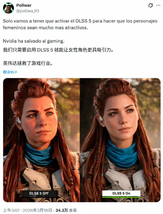 不过也有许多支持的声音,国外推主@poliwa_93分享了《地平线》女主埃洛伊在“使用”DLSS 5后的美照,喊话道:“以后我们只需要打开DLSS 5,就能让女性角色变得更有魅力了。英伟达拯救了游戏界!”