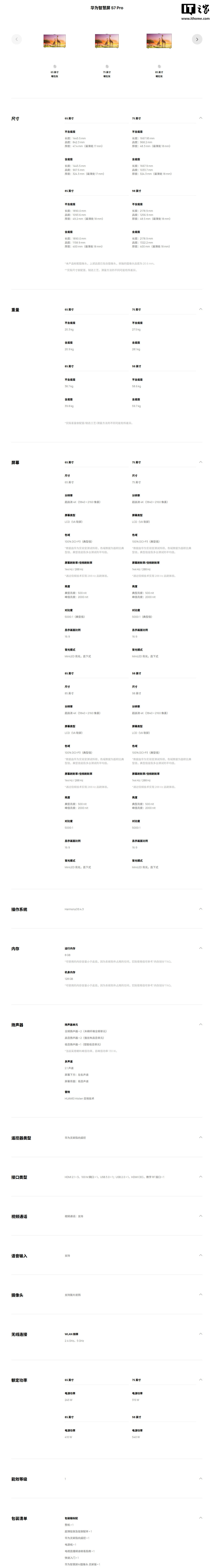 IT之家附华为智慧屏 S7 Pro 参数如下: