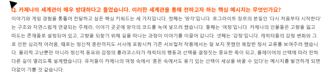 制作人金炯硕在此前接受Smilegate新闻室采访时,曾将《卡厄思梦境》世界观想要传递的核心信息归纳为三个关键词,也就是“遗忘”“旅途”与“情感”他们分别对应着肉鸽“从头再来”的机制、角色们失去故乡后踏上征程的设定、以及力求展现此前二次元作品中少见的、更为复杂的心理冲突与情绪交锋的追求。
