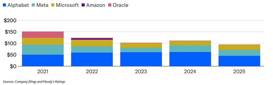 图表11:自由现金流恶化将进一步压缩股票回购空间(微软、字母表、元平台、亚马逊与甲骨文历年股票回购总额)—穆迪评级