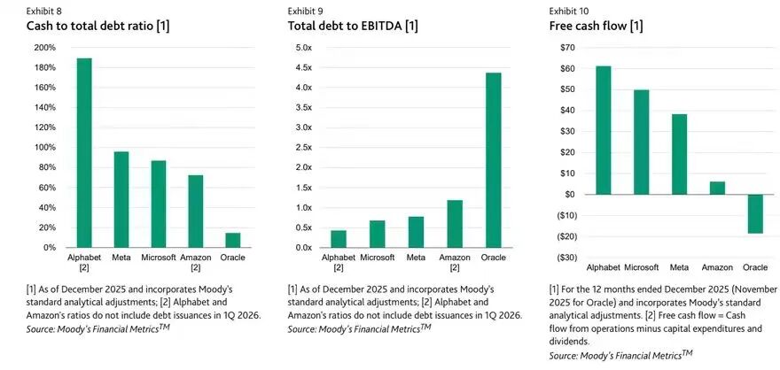 超大规模云服务商史无前例的投资规模,加剧了市场对行业产能过剩与人工智能投资回报不确定的担忧。评级最高的几家超大规模云服务商在加码人工智能基建投资前,财务状况本十分稳健,但当前风险正不断上升。2025年高额资本支出侵蚀了企业历来强劲的自由现金流,推动亚马逊、字母表、甲骨文及元平台大举发债。我们认为,资本密集度将在较长时期内维持高位,而人工智能投资盈利兑现滞后、企业对债务依赖度提升(部分企业现金储备减少),将进一步加剧其对信用指标的冲击。若不额外举债,字母表与元平台2026年的股票回购能力将受限。