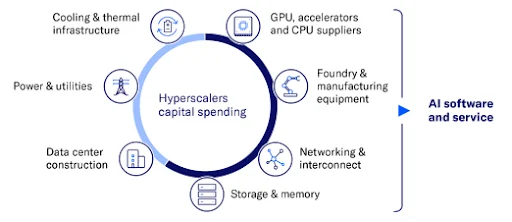 超大规模云服务商资本支出大幅攀升,呈多年增长态势。我们预计,今年其资本支出将增长81%,达到约7000亿美元,规模接近ChatGPT推出的2022年的6倍。我们认为,明年资本支出将进一步增至8200亿美元,且存在上调预期。这些投资正带动数据中心全产业链迎来爆发式增长,涵盖半导体、IT硬件、发电、建筑施工及制冷设备等领域。