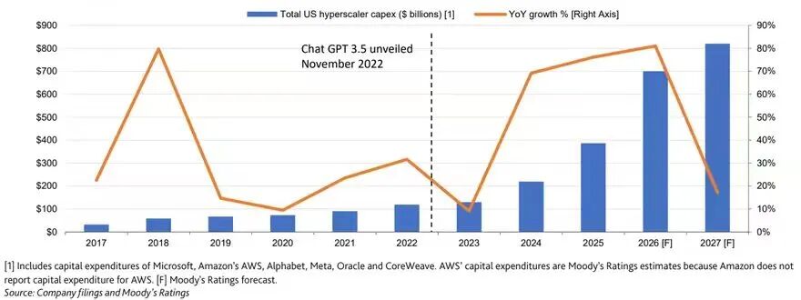 图表2:2027年超大规模云服务商资本支出增速将放缓,但仍将突破8000亿美元—穆迪评级