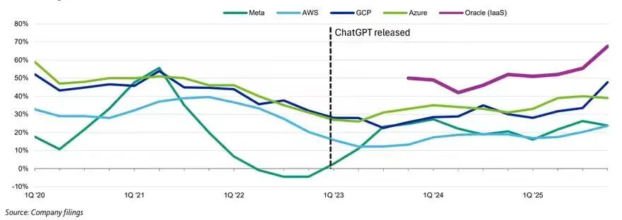 对科技企业而言,不激进投资或错失人工智能风口的风险实在过高。微软与甲骨文曾在软件业务云转型中滞后,让AWS在云计算服务领域建立了数年的领先优势。