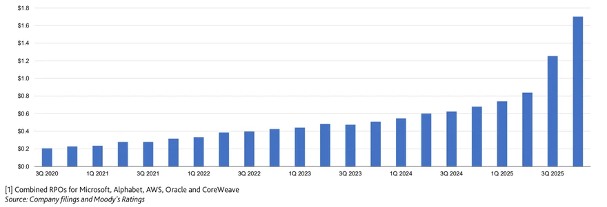 图表4:五大超大规模云服务商签约营收订单增至1.7万亿美元,为两年前的3.3倍以上(未完成履约义务,单位:十亿美元)—穆迪评级