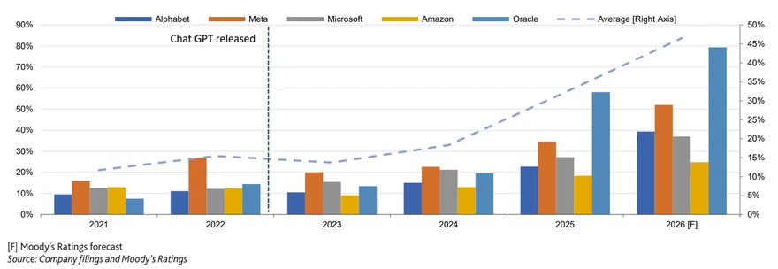 图表7:超大规模云服务商资本密集度大幅攀升,或将长期维持高位(微软、字母表、元平台、亚马逊与甲骨文资本支出/营收比)—穆迪评级