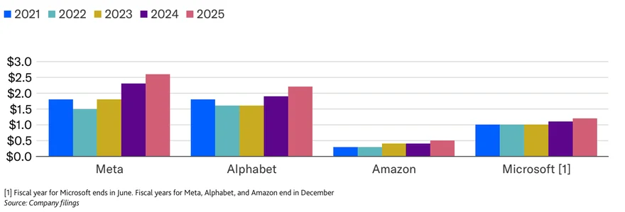 过去三年,按各自财年末计算,微软、元平台、字母表与亚马逊营收合计新增近5000亿美元,增幅44%,而员工总数仅增长约2%。此类效率提升凸显了企业业务的数字化属性,使其能灵活监控单位经济效益,平衡增长与盈利目标的投资分配。