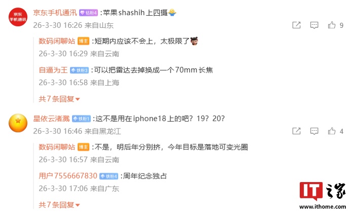 有网友询问该方案是否会在 iPhone 18 落地,博主表示:“不是,明后年分别挤,今年目标是落地可变光圈。”还有网友询问苹果何时会启用四摄方案,博主称:“短期内应该不会上,太极限了。”
